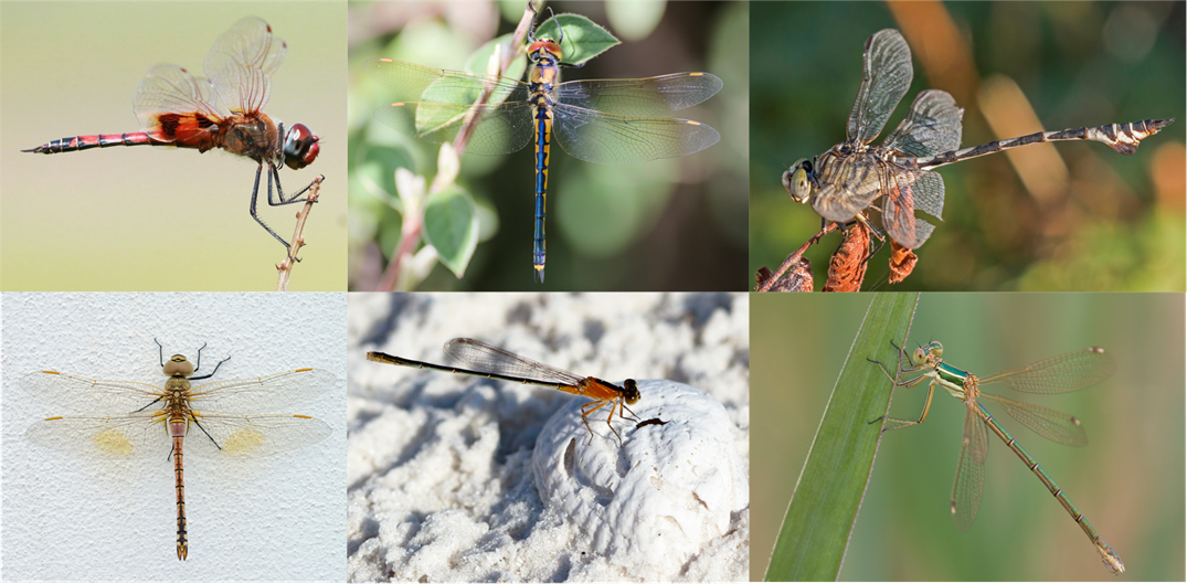 Migratory species from the six odonate families with confirmed migrants: top left Libellulidae: Tramea basilaris; top middle Cordulidae: Hemicordulia tau; top right Gomphidae: Lindenia tetraphylla; bottom left Aeshnidae: Anax ephippiger; bottom middle Coenagrionidae: Ischnura ramburii; bottom right Lestidae: Lestes barbarus. All photographs have been cropped.