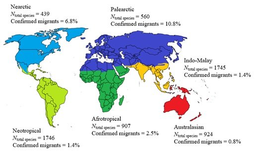Biogeographical percentage of migratory odonates worldwide